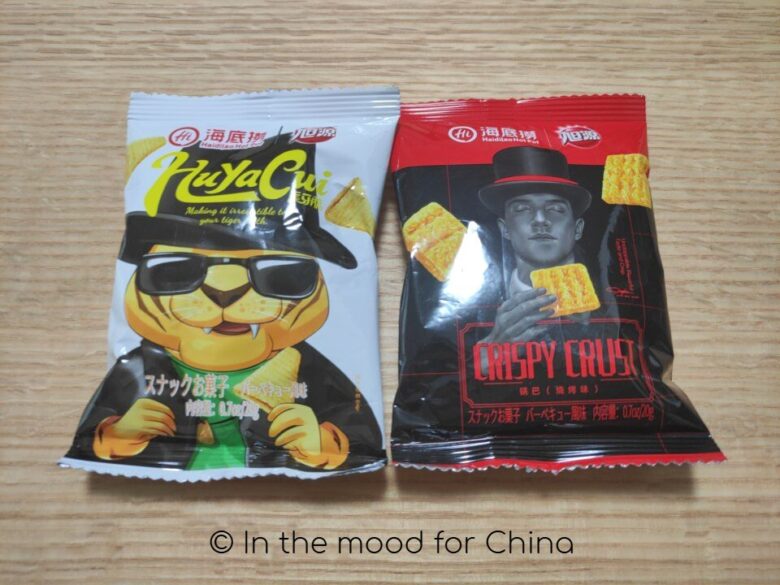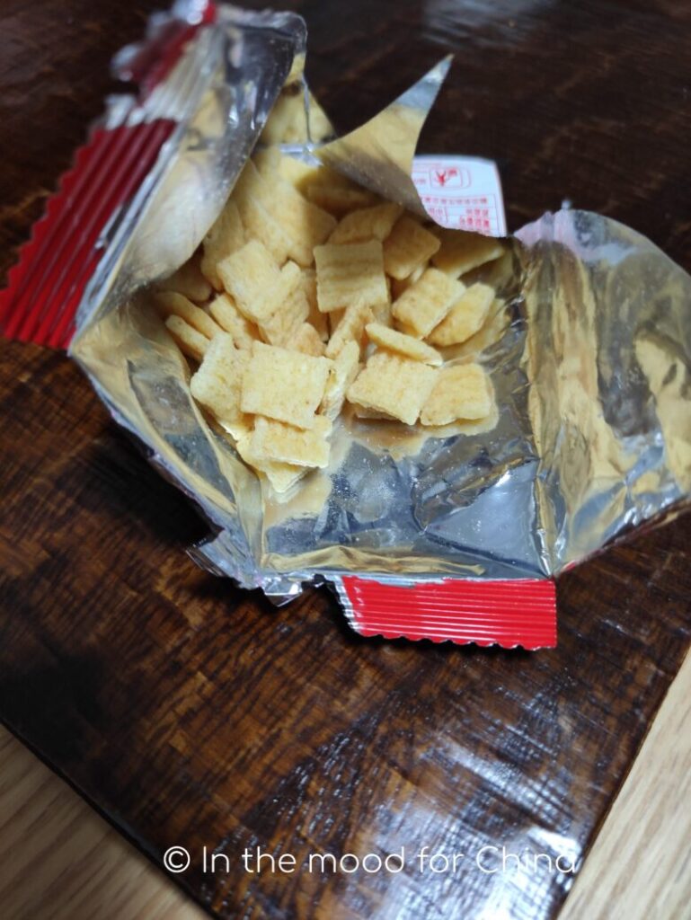 こちらが無料で貰えたスナック菓子。小さいサイズのバーベキュー味のスナック菓子が2種類ありました。特別美味しかった記憶はありませんが、中国のお菓子の中ではまだ美味しい方でした(笑)