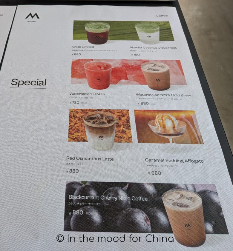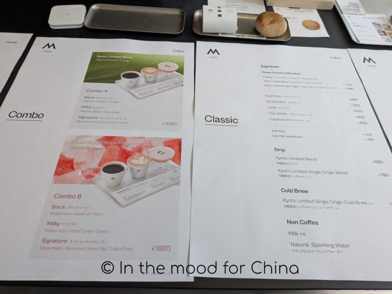 メニューはこんな感じ(下の画像1枚目と2枚目)。中国のカフェは値段がやや高めのところが多かったのですが、限定メニュー以外はわりとリーズナブルな価格でした。京都限定・期間限定のメニューもあり。