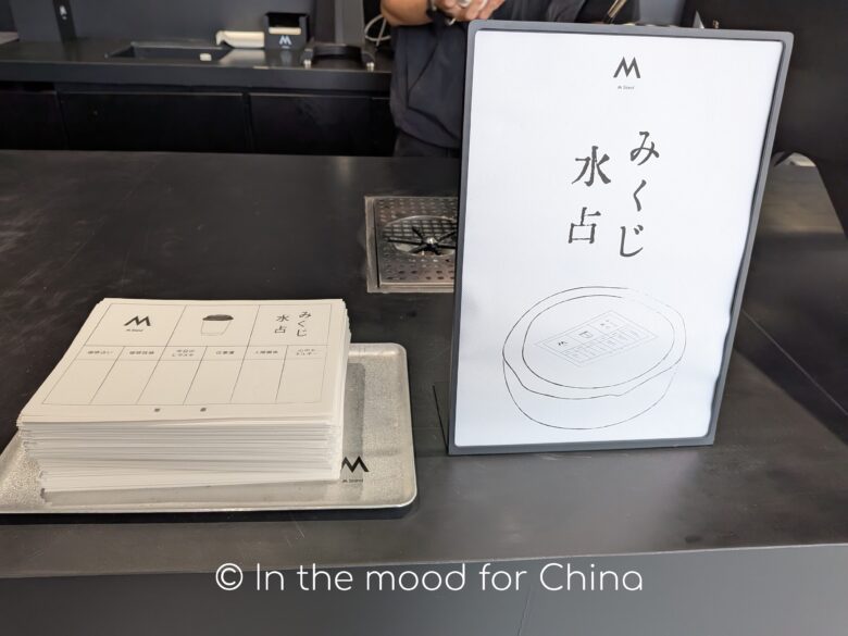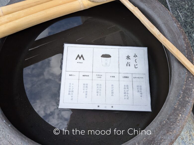 レジ横にはなんと水占みくじがあり、お店の外にある水に浮かべると運勢が浮かび上がりました。結果は・・・大吉でした!
